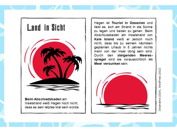 Wenn du die Augen geschlossen hast, dann reise in Gedanken langsam (über Straßen und Felder hinweg) ans Meer. Du kannst bereits den charakteristischen Duft riechen und allmählich kommt das Geräusch der Wellen näher. Jetzt siehst du den Strand. Stell dir vor, du setzt dich in den Sand und schaust auf die Wellen. Nimm dir einen Moment vor und achte darauf, welche Gedanken dir nun durch Kopf gehen. Was siehst du vor deinem geistigen Auge, was kannst du hören, was fühlen?Lassen Sie anschließend die Lernenden nach dem Öffnen ihrer Augen mit Hilfe eines digitalen Tools (z.B. Mentimeter) oder von Moderationskarten eine Wortwolke aus Assoziationsbegriffen oder Wortgruppen erstellen, in welcher die Gedanken aus der Assoziationsübung festgehalten werden. Nutzen Sie anschließend die entstandene Wortwolke, um im Plenumsgespräch auf die Assoziationen der Lernenden einzugehen und gegebenenfalls einen Ausgangspunkt für die (fachliche) Auseinandersetzung mit dem Thema Ozean zu kreieren.