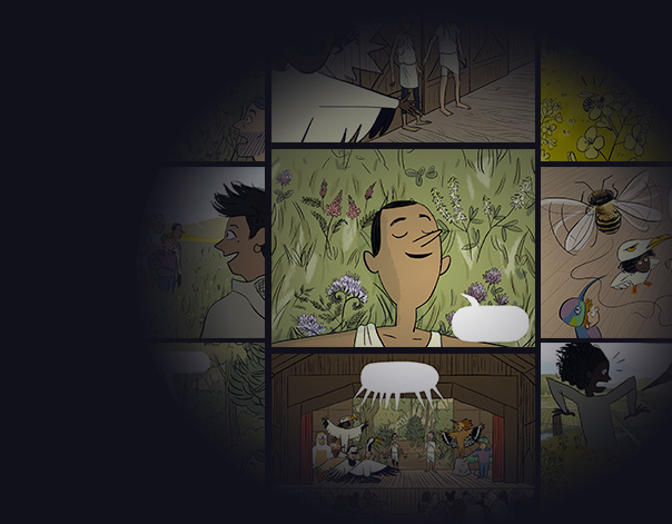 The three chapters that make up this Science Comic are sequential. In the first chapter, the reader learns about the theater play that the Supertroupers are challenged to perform - the play ‘The birds’ - as well as the issue they will explore - the importance of bees and their role in ecosystems.