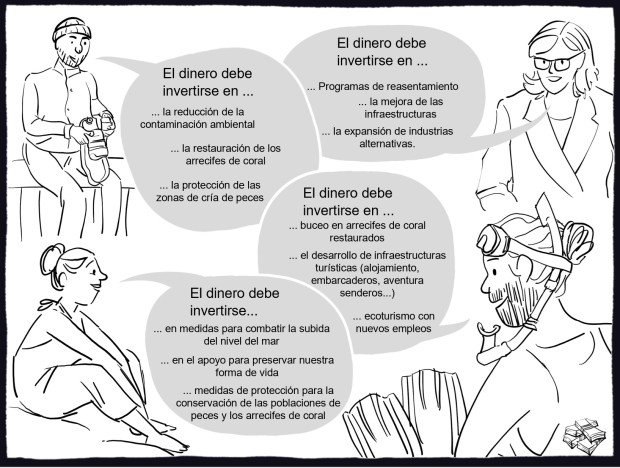 Este tema se centra en las discusiones que mantiene la gente en torno al uso de la Gran Barrera de Coral. Explorarás las diferentes perspectivas de las familias de pescadores que Iris conoció en el cómic.