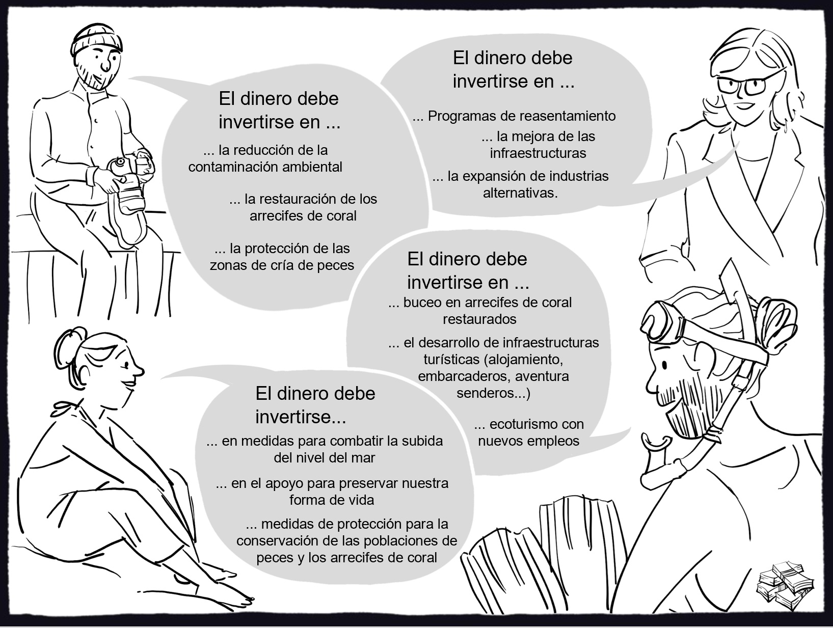 c)Escribe una declaración en la que describas cómo, en tu opinión, debería invertirse el dinero para mejorar la situación de las familias de pescadores.