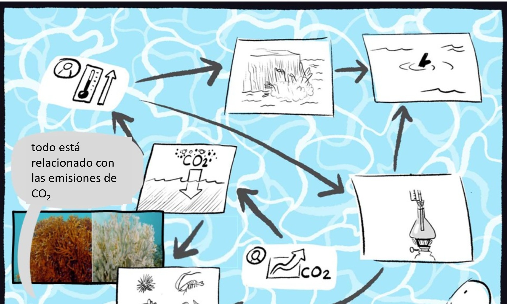 El cómic científico explora la intrincada relación entre el cambio climático y el ecosistema oceánico, destacando cómo se influyen mutuamente. Su principal objetivo es transmitir la complejidad de este sistema biológico y animar a los estudiantes a mejorar sus habilidades de pensamiento sistémico. En reconocimiento de la investigación educativa actual, según la cual los conocimientos por sí solos no bastan para promover un comportamiento respetuoso con el medio ambiente, el episodio también trata de implicar a los estudiantes a nivel emocional, fomentando una conexión personal con el océano. El objetivo es lograr un equilibrio entre la revelación de realidades alarmantes y la inspiración de energía proactiva, motivando a los estudiantes a imaginar y trabajar hacia soluciones futuras en lugar de sentirse abrumados. Además, el Cómic Científico ofrece numerosas oportunidades para realizar investigaciones de seguimiento y diseñar experimentos en el aula. -