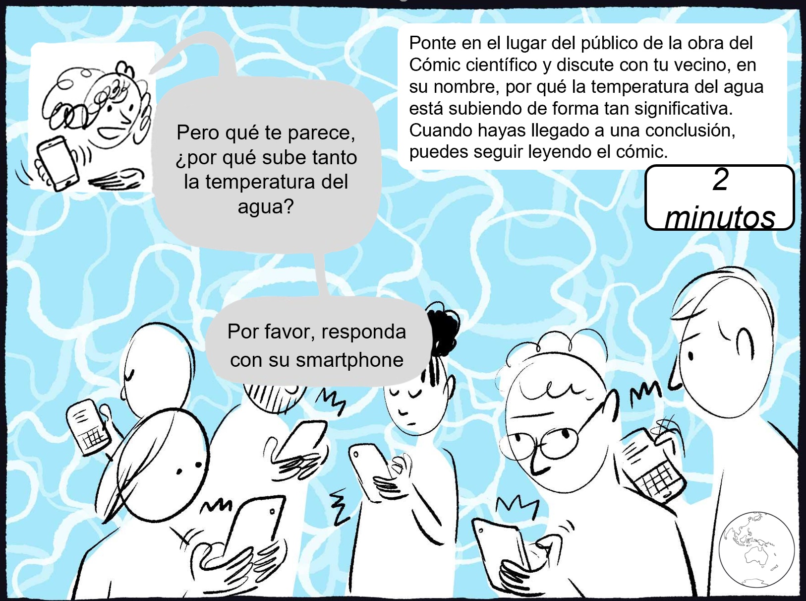 Tarea 1: Ponte en el lugar del público de la obra del Cómic científico y discute con tu vecino, en su nombre, por qué la temperatura del agua está aumentando de forma tan significativa. Cuando hayas llegado a una conclusión, puedes seguir leyendo el cómic científico.