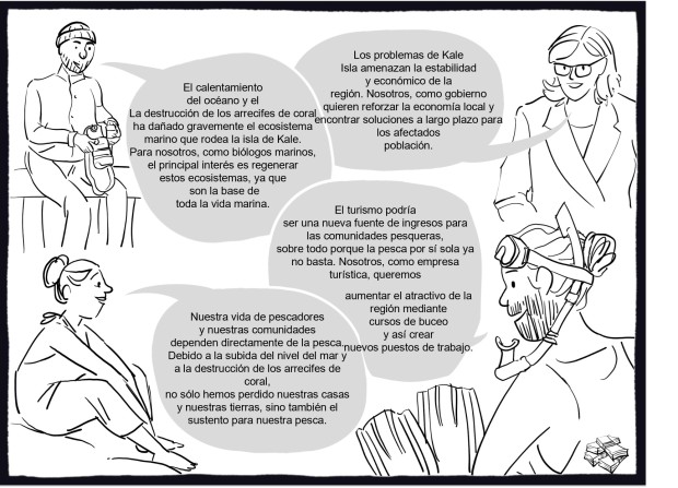 A continuación, los alumnos leen el Cómic científico de forma independiente. Pida a los alumnos que detengan la recepción después de los dos primeros capítulos. Antes de pasar al tercer capítulo, pueden elegir entre dos temas diferentes. Deje que trabajen en parejas. Utilizando las hojas de trabajo, profundizarán sus conocimientos sobre el blanqueamiento del coral o desarrollarán su capacidad para cambiar de perspectiva en relación con las decisiones políticas sobre el turismo en las zonas protegidas. Ambas tareas opcionales incluyen textos informativos, ilustraciones y las llamadas viñetas conceptuales