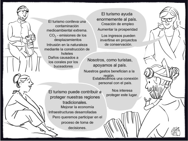Fíjate en los argumentos que aparecen en los bocadillos de la viñeta conceptual. Discute si debería ampliarse el turismo en la Gran Barrera de Coral.