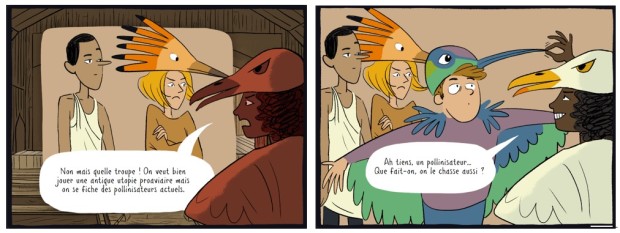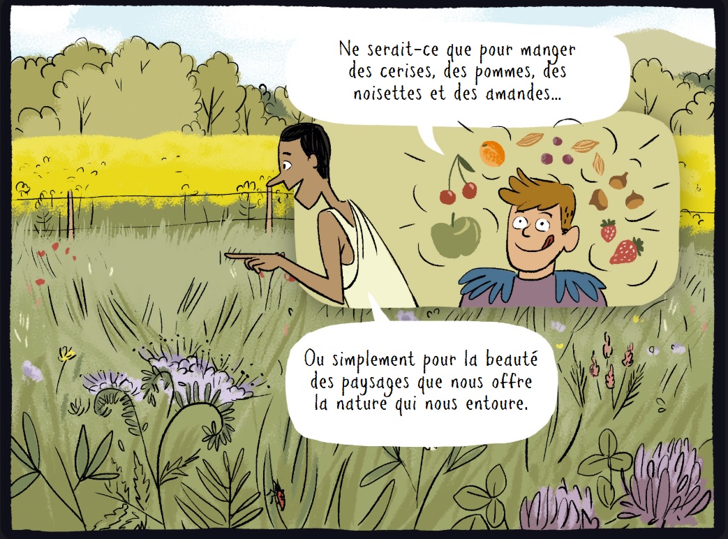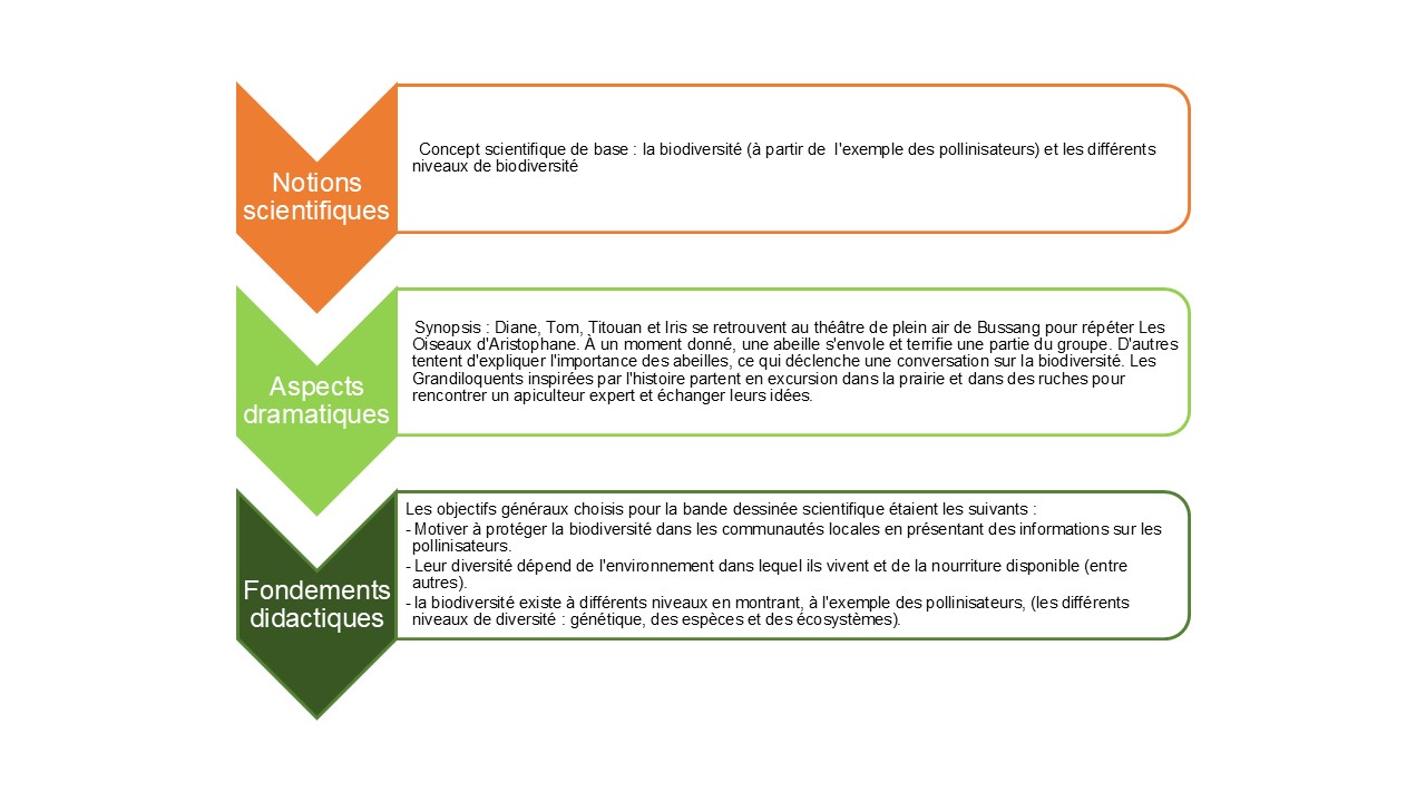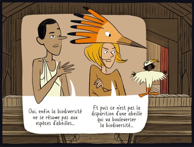 ● Lecture complète (des 3 chapitres) / lecture partielle : Les trois chapitres qui composent cette bande dessinée scientifique sont séquentiels. Dans le premier chapitre, le lecteur découvre la pièce de théâtre que Les Grandiloquents doivent jouer - la pièce Les oiseaux - ainsi que le sujet qu'ils vont explorer - l'importance des abeilles et leur rôle dans les écosystèmes. Alors que le deuxième chapitre est entièrement consacré à l'étude des questions liées à la biodiversité et à ses différentes dimensions, le troisième épisode se concentre sur la représentation théâtrale. Bien qu'il soit conseillé de lire les trois chapitres, il est possible de le faire en partie, ce qui permet de contourner/retarder certaines contraintes de temps ou d'encourager la créativité des élèves. La lecture du seul 1er chapitre pourrait servir de point de départ à une recherche sur les abeilles et l'importance de la préservation de la biodiversité, et éventuellement à la réalisation d'une bande dessinée qui mettrait en valeur les connaissances acquises au cours de la recherche. La lecture du 3ème chapitre peut également être faite dans le même but. Opter pour le 2e chapitre sera judicieux si vous souhaitez mettre l'accent sur le concept de biodiversité et ses différentes dimensions.