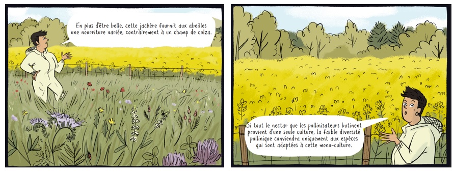 ©Bergey & Govin, Stimuli Eds, 2024 Réponse possible : Le deuxième chapitre de la bande dessinée met en évidence trois niveaux de biodiversité : la variabilité génétique, la diversité des espèces et la diversité des écosystèmes. La variabilité génétique fait référence aux variations au sein des individus d'une espèce, qui sont cruciales pour la résistance aux pressions environnementales. L'apiculteur explique comment une population végétale génétiquement diversifiée résiste mieux aux parasites qu'une monoculture. La diversité des espèces est la variété des espèces au sein d'un écosystème. La BD insiste sur le fait que des espèces végétales diversifiées favorisent la présence de pollinisateurs, d'oiseaux et d'autres espèces sauvages, contribuant ainsi à la santé de l'écosystème. La diversité des écosystèmes englobe la gamme des différents écosystèmes, tels que les prairies, les forêts et les cours d'eau. Chaque écosystème abrite des espèces uniques, essentielles au maintien de la biodiversité globale. Ces trois niveaux sont essentiels à la survie des pollinisateurs et des écosystèmes qu'ils soutiennent.