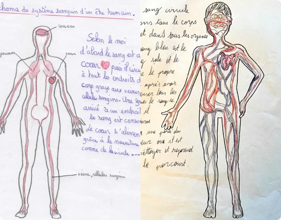 Photo Jean MURRAT As duas concepções propostas não deixam dúvidas, quer através do esquema quer do texto, sobre a sua visão do fluxo do sangue no organismo. Mas muitas das outras produções dos alunos são menos explícitas. Apenas a direção do fluxo sanguíneo, representada por setas, permite classificar com toda a certeza a conceção de um aluno. No entanto, as outras indicações, sobretudo se forem numerosas e coerentes, permitem estabelecer uma categorização provável. Segue-se uma lista de pistas a procurar, tanto no texto como no esquema, para analisar as concepções dos alunos sobre a circulação sanguínea.