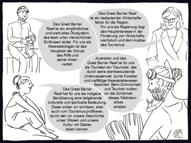 Betrachtet und die Argumente in den Sprechblasen im Concept Cartoon. Diskutiert, ob der Tourismus am Great Barrier Reef weiter ausgebaut werden sollte.