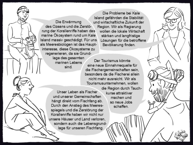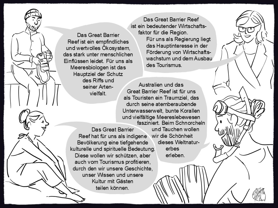 Dieses Thema fokussiert die Diskussion, die Menschen rund um die Nutzung des Great Barrier Reefs führen. Ihr beschäftigt euch mit den verschiedenen Perspektiven der Fischerfamilien, die Iris im Comic getroffen hat.