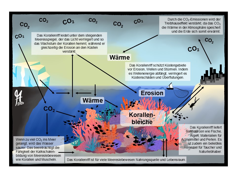 Ahnert, 2024 d) Diskutiert gemeinsam, welche Komponenten und Interaktionen die Korallenbleiche verursachen. Benennt Maßnahmen, die das Ausbleichen der Korallen verringern oder stoppen könnten.