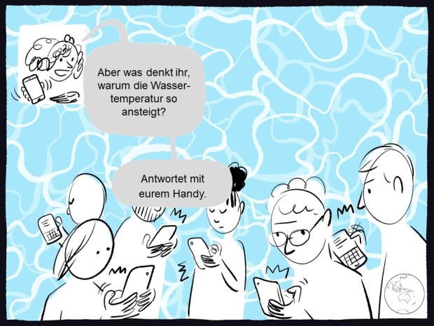 Aufgabe 1: Versetzt euch in das Publikum des Theaterstücks aus dem Comic hinein und diskutiert in ihrem Namen, warum die Wassertemperatur so stark ansteigt. Wenn ihr zu einem Ergebnis gekommen seid, dürft ihr den Comic weiterlesen.
