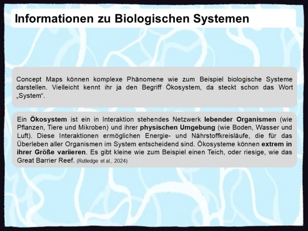 Infotext: Ihr sollt euch jetzt mit den Systemkomponenten und Systeminteraktionen befassen. Wie ihr vermutlich schon festgestellt habt, stehen Knoten in eurer Concept Map oftmals für Systemkomponenten und die Verbindungspfeile und -wörter oftmals für die Systeminteraktionen.