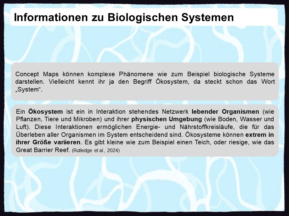 Um ein komplexes System zu verstehen, müssen wir die Organisation auf mehreren Ebenen, die heterogenen Komponenten und die dynamischen Prozesse, die daran beteiligt sind, begreifen. Dies erfordert eine Änderung des Schwerpunkts unseres Verständnisses: Es geht nicht mehr nur darum, die Elemente zu identifizieren, aus denen das System besteht, sondern darum, seine Struktur, d. h. die Wechselwirkungen und die damit verbundenen Mechanismen, seine Dynamik, d. h. die Art und Weise, wie sich das System im Laufe der Zeit entwickelt, und seine Steuerung zu verstehen (Kitano, 2002). Es reicht nicht aus, die Eigenschaften und Verhaltensweisen isolierter Elemente zu kennen, um das Gesamtverhalten des Systems zu verstehen. Es ist darüber hinaus notwendig, die komplexen und hierarchischen Beziehungen zwischen der Struktur eines Systems (das Was, die Elemente, die Komponenten des Systems), den Mechanismen (das Wie, die Verhaltensweisen der Elemente des Systems) und den Funktionen, d. h. dem Warum eines Systems, zu untersuchen (Hmelo-Silver, Marathe, & Liu, 2007).Mehrere Studien (Assaraf & Orion, 2005; Fournier, 2015; Hmelo-Silver et al., 2007) haben gezeigt, dass Schüler Schwierigkeiten haben, komplexe Systeme zu verstehen: