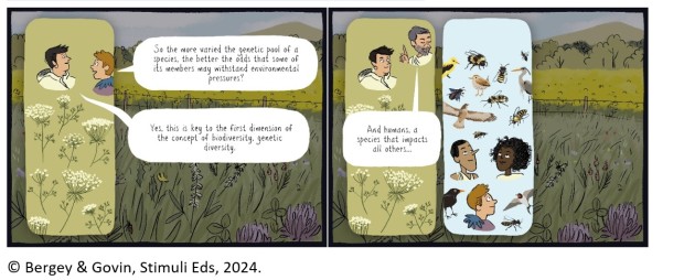 The second chapter of the comic highlights three levels of biodiversity: genetic variability, species diversity, and ecosystem diversity.
