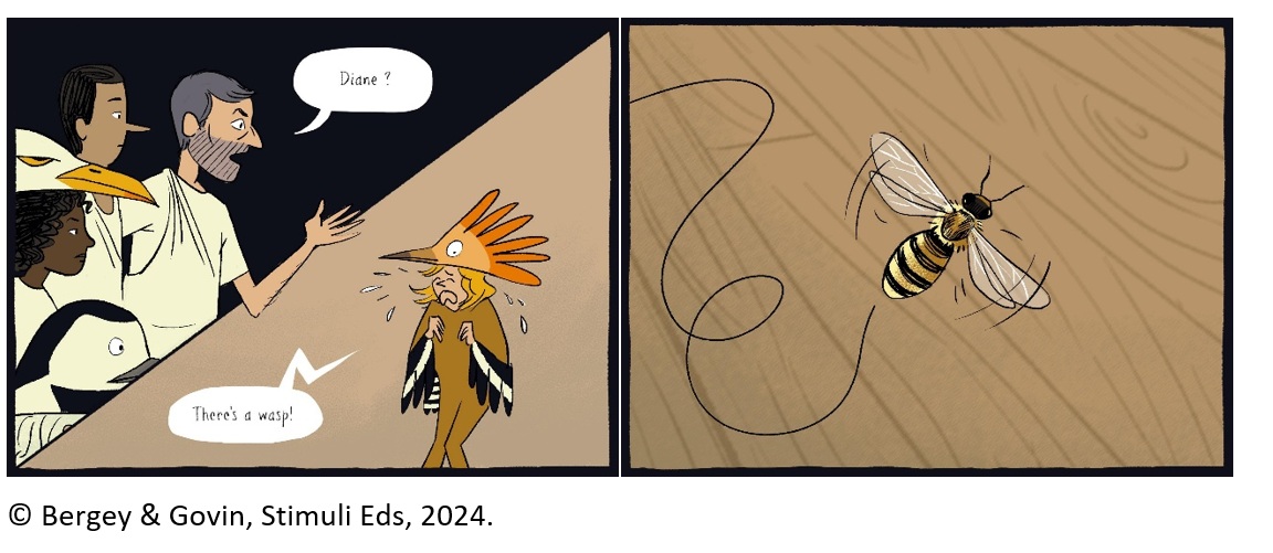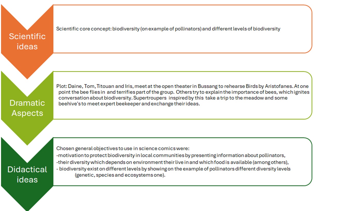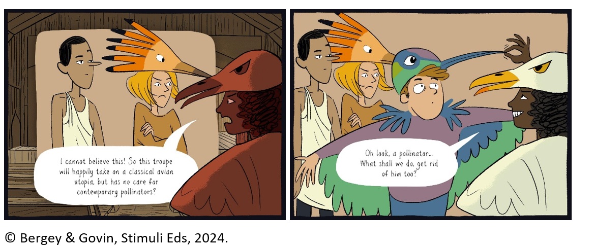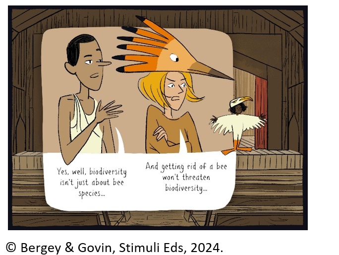 The three chapters that make up this Science Comic are sequential. In the first chapter, the reader learns about the theater play that the Supertroupers are challenged to perform - the play ‘The birds’ - as well as the issue they will explore - the importance of bees and their role in ecosystems.