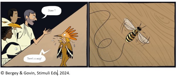 While the Supertroupers are rehearsing the play ‘The Birds’, an old comedy written by Aristophanes, a bee appears on stage, which frightens some of the group. After a discussion about what to do with the bee, the group decides to visit a beekeeper in the village to better understand how bees live and what role they play in ecosystems. On this occasion, they also take the opportunity to learn a little more about what biodiversity is, in its various dimensions, and how it can be protected. The lessons learnt from this visit will later be used in the play they are putting on, taking advantage of the theatre’s ability to open the back wall, giving access to a wooded area rich in life.