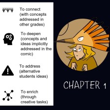 Reading can be continuous or, on the contrary, interrupted with the aim of sharing ideas at strategic moments. Among other activities, the interruptions can be used for research tasks or debates on the different theories. For exploring the resource, teachers can use the Teachers’ version of the comics (see the complementary resources), in which some ideas and connections are signalized, mainly related with aspects: