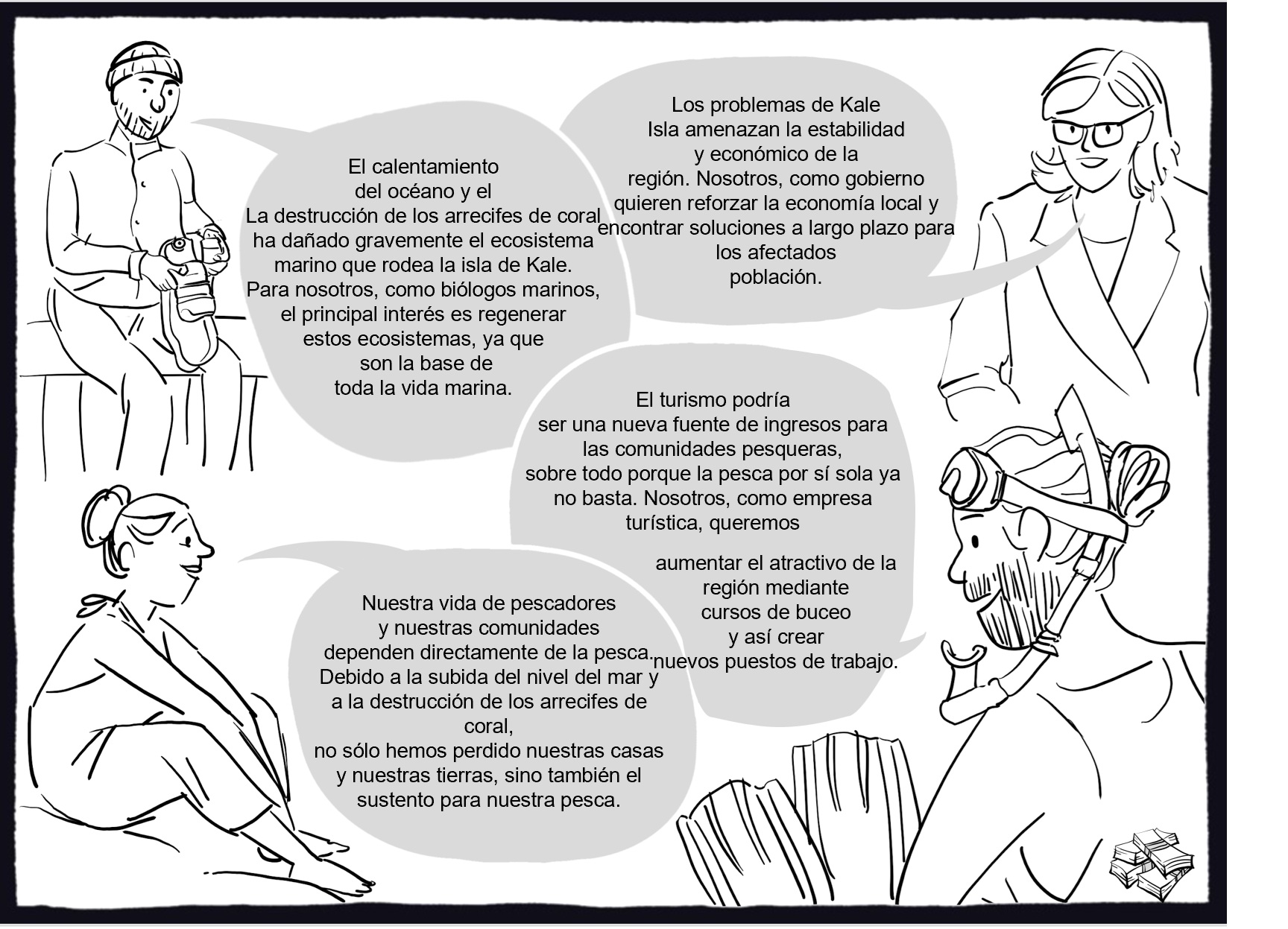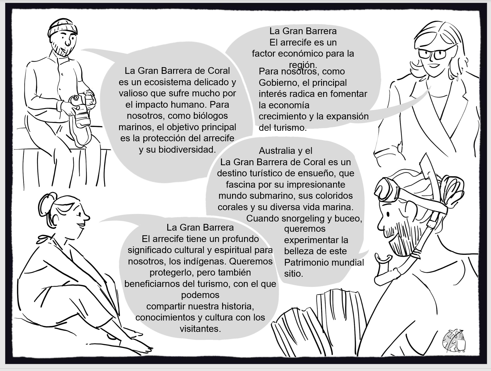 Este tema se centra en las discusiones que mantiene la gente en torno al uso de la Gran Barrera de Coral. Explorarás las diferentes perspectivas de las familias de pescadores que Iris conoció en el cómic.