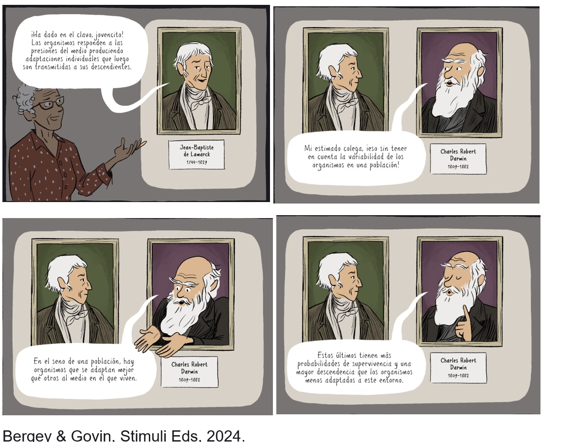 Este pasaje pone de relieve los dos modelos históricos de Lamarck y Darwin. Los alumnos pueden establecer el vínculo con su propio modelo explicativo y ver los parecidos o las diferencias con los dos modelos propuestos. Esta tarea también es una oportunidad para abrir un debate sobre la validez de ambos modelos.