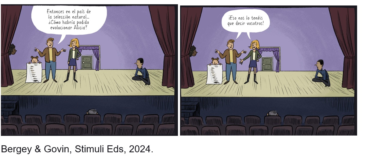 En 1859, Charles Darwin publica su famosa obra sobre el origen de las especies. Tres años después, Charles Lutwidge escribe Las aventuras de Alicia en el país de las maravillas, que publicará en 1865 bajo el seudónimo de Lewis Carroll. A lo largo del episodio «Evolución» del webcómic Los grandilocuentes se exploran varios vínculos (im)probables entre la Alicia de Lewis Carroll y la teoría de la evolución, tanto de forma implícita como explícita.