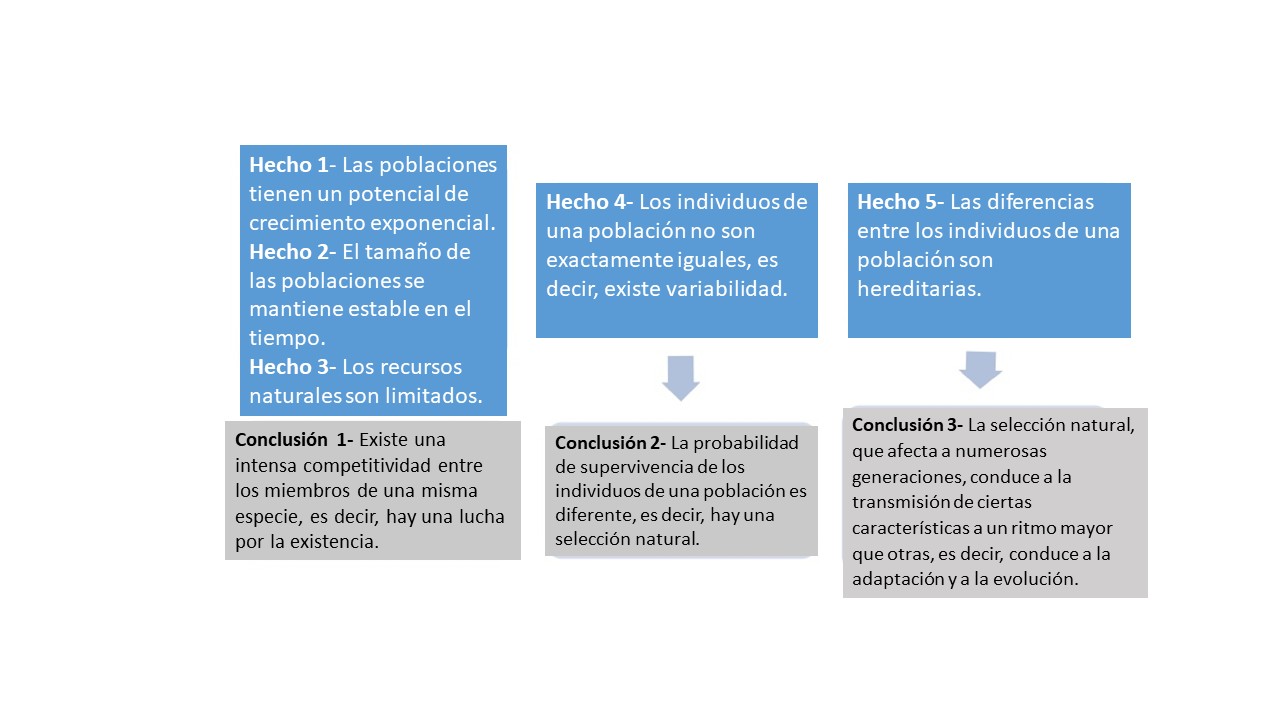 Según Darwin, los organismos de una población presentan variabilidad. Los organismos mejor adaptados al medio tienen más probabilidades de sobrevivir que los menos adaptados y dejan un mayor número de descendientes. Por lo tanto, el medio selecciona a los organismos mejor adaptados y estos transmiten sus características hereditarias a sus descendientes. Con el paso del tiempo, este proceso conduce a la diversificación de los organismos y a la formación de nuevas especies (especiación).