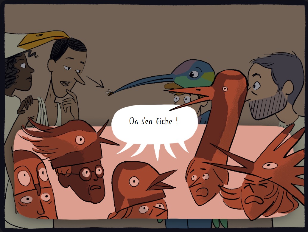 ● Lecture complète (des 3 chapitres) / lecture partielle : Les trois chapitres qui composent cette bande dessinée scientifique sont séquentiels. Dans le premier chapitre, le lecteur découvre la pièce de théâtre que Les Grandiloquents doivent jouer - la pièce Les oiseaux - ainsi que le sujet qu'ils vont explorer - l'importance des abeilles et leur rôle dans les écosystèmes. Alors que le deuxième chapitre est entièrement consacré à l'étude des questions liées à la biodiversité et à ses différentes dimensions, le troisième épisode se concentre sur la représentation théâtrale. Bien qu'il soit conseillé de lire les trois chapitres, il est possible de le faire en partie, ce qui permet de contourner/retarder certaines contraintes de temps ou d'encourager la créativité des élèves. La lecture du seul 1er chapitre pourrait servir de point de départ à une recherche sur les abeilles et l'importance de la préservation de la biodiversité, et éventuellement à la réalisation d'une bande dessinée qui mettrait en valeur les connaissances acquises au cours de la recherche. La lecture du 3ème chapitre peut également être faite dans le même but. Opter pour le 2e chapitre sera judicieux si vous souhaitez mettre l'accent sur le concept de biodiversité et ses différentes dimensions.