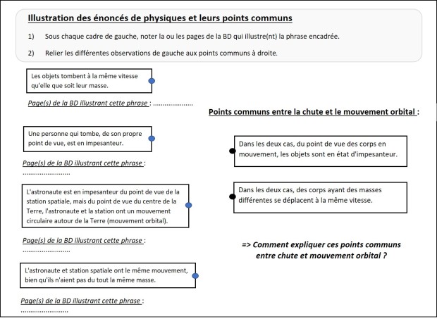Une fois les scènes interprétées, il est possible d'adopter l'approche inverse : demander aux élèves d'illustrer des énoncés généraux de physique à l'aide d'images spécifiques de la bande dessinée. Il est également possible de leur faire relier explicitement les points communs entre la chute et le mouvement orbital. Voici un exemple d'exercice (version modifiable ci-dessous).