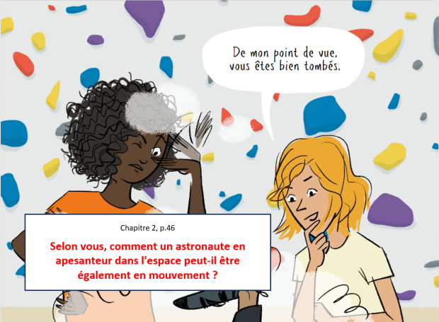 Après une première lecture individuelle de la bande dessinée par les élèves, il peut être utile de commencer par expliquer le problème physique qui apparaît dans le premier chapitre : "La gravitation est-elle présente dans l'espace ou non ? Pour ce faire, on peut interroger les élèves sur la position des différents personnages sur cette question et sur leurs arguments.