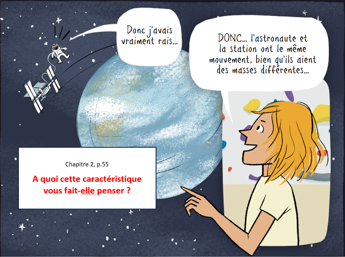 Un prérequis essentiel concerne le phénomène de chute libre. Même s’il est très courant, les premiers essais en classe de séances utilisant la BD ont montré que beaucoup d’élèves de seconde peuvent rester très étonnés du fait que la vitesse de chute d’un objet soit indépendante de sa masse, quand l’influence de l’air est négligeable. Leur focalisation sur ce point a détourné l’attention des informations venant dans la suite du récit, visant à relier mouvement de chute et mouvement orbital. Il est ainsi fortement recommandé de faire un rappel de cette observation en amont de la séance, afin que les élèves puissent davantage se focaliser sur le chapitre 2.