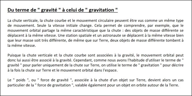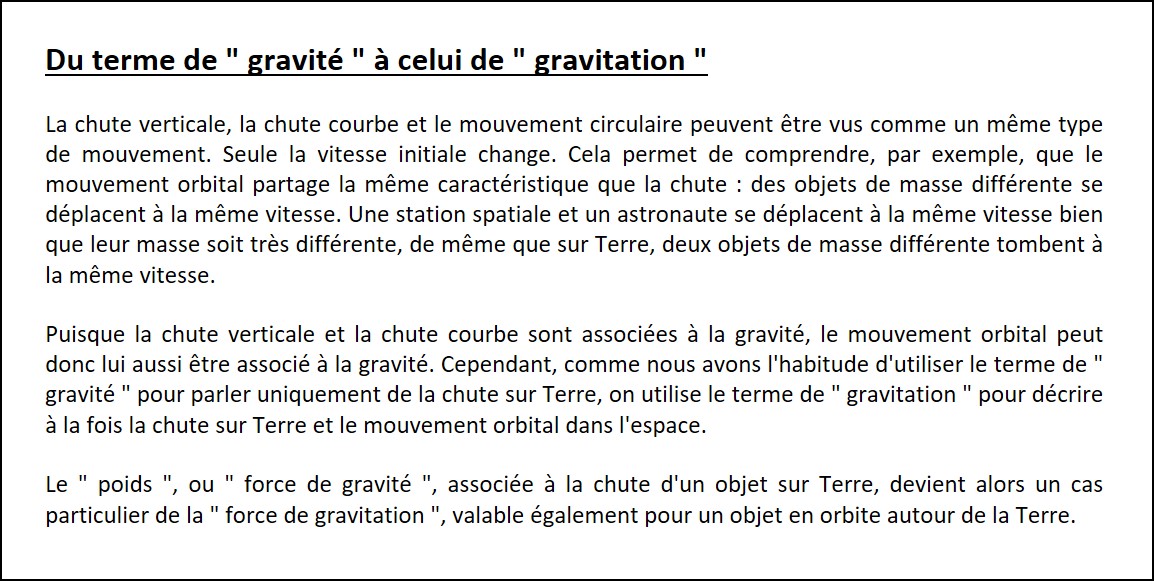 Une fois ces points communs mis en évidence, la question de leur explication peut être posée : comment comprendre que ces mouvements, qui semblent si différents, partagent les mêmes caractéristiques ? L'expérience de pensée du " canon newtonien " évoquée au chapitre 3 permet alors de comprendre la continuité entre ces différents mouvements, justifiant ainsi leurs points communs. L'extrait de livre du document A ci-dessus propose une interprétation originale de ce schéma. A ce stade, le lien entre les différents éléments n'est peut-être pas encore très clair pour les élèves. Un lien explicite peut être nécessaire. Le document B en donne un bref aperçu. Il précise notamment la différence entre les termes "gravité" et "gravitation", et indique que le mouvement orbital peut être associé à la gravitation. Il ne reste alors plus qu'une étape à franchir pour que les élèves déduisent que la gravitation est bien présente dans l'espace, ce qui répond au problème initial.- Deuxième séance (1h)