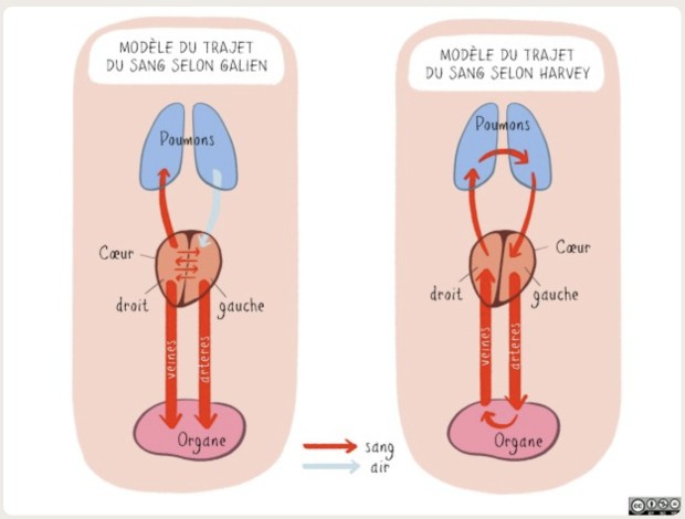 o Comparação dos modelos de Galeno e de Harvey: quais são as diferenças entre eles e quais são as consequências para a nutrição dos órgãos? Para o modelo de Galeno, é necessária uma renovação constante do sangue porque os órgãos consomem-no. No modelo de Harvey, o sangue precisa de ser reabastecido com oxigénio e nutrientes. Isto permite aos alunos refletir sobre a organização funcional da circulação sanguínea.