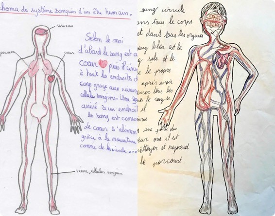 Photo Jean MURRAT As duas concepções propostas não deixam dúvidas, quer através do esquema quer do texto, sobre a sua visão do fluxo do sangue no organismo. Mas muitas das outras produções dos alunos são menos explícitas. Apenas a direção do fluxo sanguíneo, representada por setas, permite classificar com toda a certeza a conceção de um aluno. No entanto, as outras indicações, sobretudo se forem numerosas e coerentes, permitem estabelecer uma categorização provável. Segue-se uma lista de pistas a procurar, tanto no texto como no esquema, para analisar as concepções dos alunos sobre a circulação sanguínea.